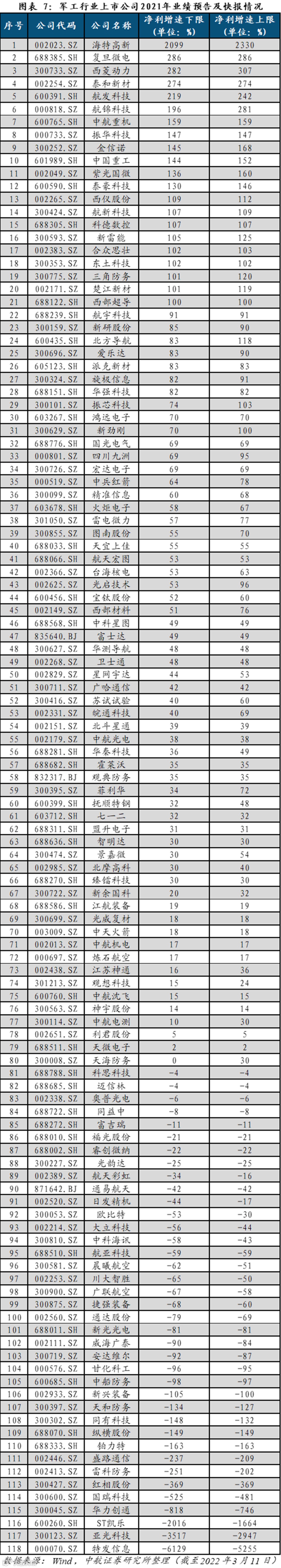 近日上市公司集中发布业绩快报或者1-2月经营情况,截至2022年3月11日,已有118家军工行业上市公司披露了2021年业绩预告,80家上市公司业绩预增。2020年这些公司净利润增速中位数为27%,2021年预告的净利润增速下限中位数为33%,增速上限为38%,增速大幅提升。我们预计,军工行业内多数上市公司实现2021年年报预喜,将进一步提升军工行业的置信度,坚定市场对军工行业价值属性的认知。