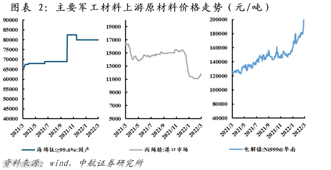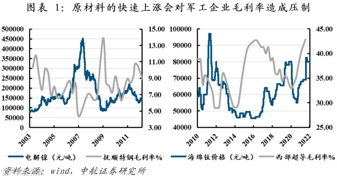 然而,军工行业不能等同于周期行业。军品有着价格刚性,但也有着利润刚性。价格刚性,是指军品价格短期内难以灵活调整,这也意味着涨价压力短期内难以充分传导至下游,导致行业利润率出现波动的可能。利润刚性,是指长周期看,军工行业利润率和成本端相关性并不大,军品最重要是保交付,有军队和国家兜底,成本抬高导致缩减的利润,将通过未来军品的调价补价,大部分得以补回,一旦出现短期涨价过快、成本压力过大,以致于影响军品生产,则会启动临时调价机制。民用钛合金和军用钛合金,民用高温合金和高温合金,行业属性迥异。上游的涨价是可传导的,这其实恰恰是军工行业的稳定之处、优越之处,军工的供给冲击,是暂时的,是短期的,不应该将其长期化和放大化。