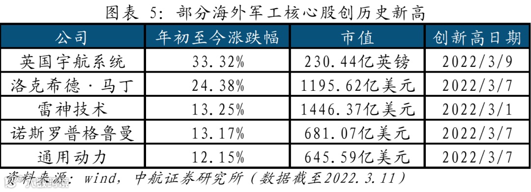 同时,我们也可以注意到,今年以来尤其是俄乌冲突激化后,海外军贸业务上市公司实现较大幅度的上涨,洛马、雷神等近期皆创出历史新高。