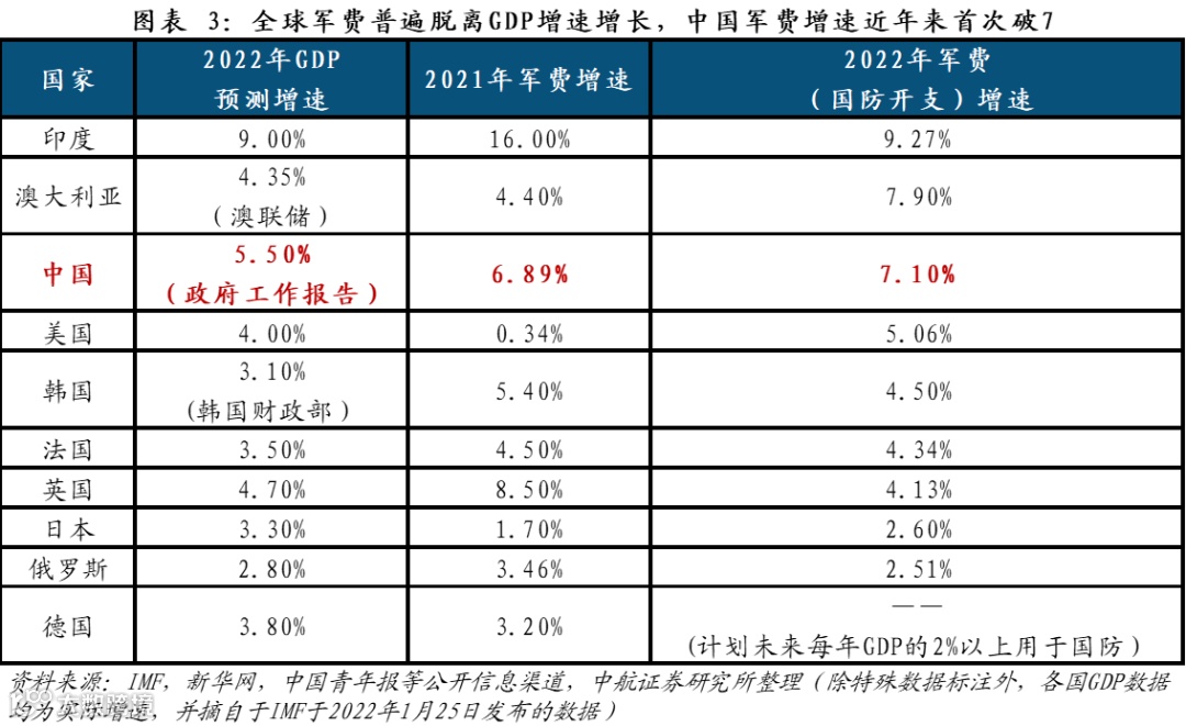 按照IMF预测以及政府报告披露的2022年中美GDP增速(及目标),我们测算,2022年中国国防预算占GDP比例约为1.20%,远不及美国的3.25%,这也反映出当前我国国防实力与经济实力仍然不匹配,这是现实矛盾,且愈加紧迫。我们认为,2022年的军费预算意义重大。一方面,当前仅仅是军工行业全面扩产的早期,军费预算直接反映出国防建设的节奏,另一方面,在疫情时代,全球政治、经济以及军事格局不确定性巨大,多个国家公布的军费预算增速大幅增长。2022年中国军费预算增长7.10%已经算是近年来一个不低且合理的增速,体现出了政府决策在稳字当头,稳中求进的总基调下,加快国防和军队现代化,实现富国和强军相统一仍将是我国国防建设的主旋律。去年两会至今,我国推出《军队装备试验鉴定规定》、《军队装备订购规定》等规范装备订购相关工作制度,凸显出我国军费正在规模数“量”以及使用“效”率两个方向发力,共同支撑我国国防建设和军工行业发展规模性的快速增长以及结构性的转型升级。军费“量”和“效”两方面的提升,都将促使军工行业在数量、质量和结构三个维度都迎来实质性的重大变化和历史性的发展机遇,推动“十四五”军工行业迎来一个成长和价值兼备且景气度持续提升,高景气增长预期不断被巩固、兑现验证并强化的新时期和大时代。