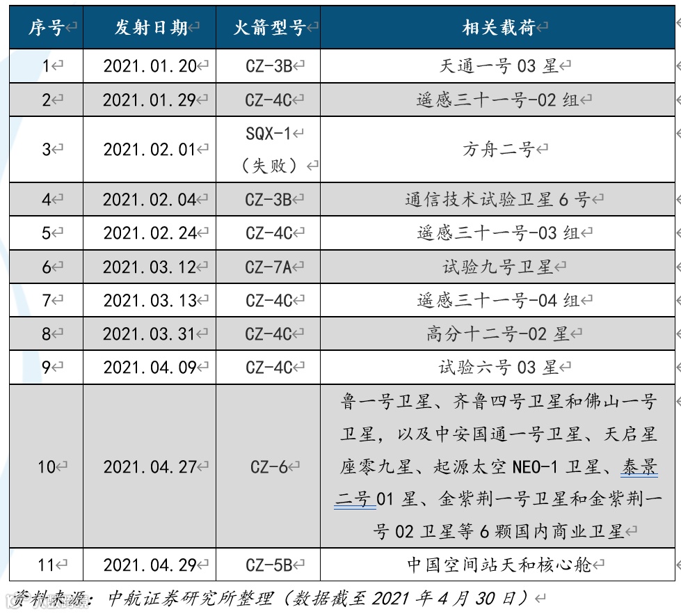 此外,“十四五”期间,航天产业也有望迎来高景气发展。作为十四五元年的2021年,航天科技集团在年初计划安排40余次宇航发射任务,截至到2021年4月30日,我国已经进行了11次航天发射,相较于2019年的5次以及2020年的8次均有所提高。诸多型号的发射,均预示着我国“十四五”重大航天工程中的载人航天空间站工程建设大幕即将拉开,而未来依靠该类航天重大项目订单驱动的航天装备产业链上的相关上市公司业绩也有望兑现。
