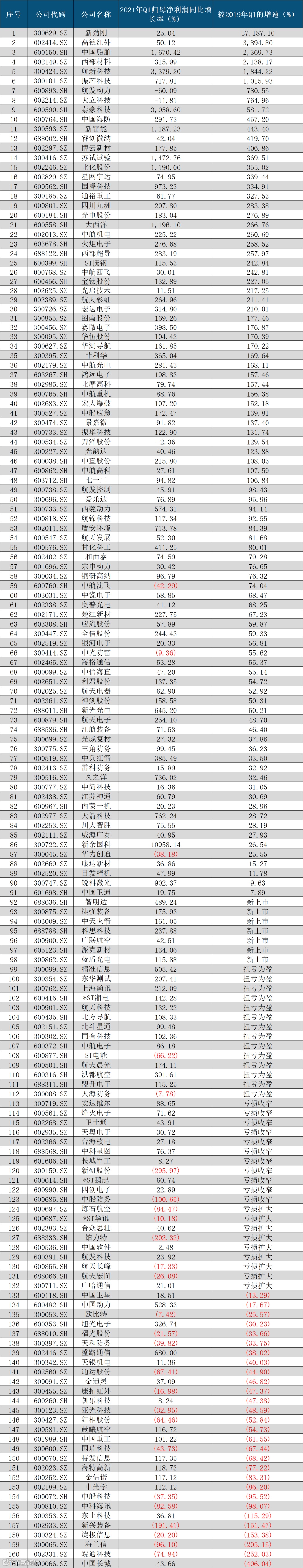个股方面,不考虑资产重组的影响,高德红外(2021年一季度归母净利润较2019年一季度的增速+3894.80%)、西部材料(+2138.17%)、航新科技(+1844.22%)、振芯科技(+1015.93%)、航发动力(+780.55%)等上市公司2021一季度业绩相较于2019一季度增速居前,尤其是航空航天装备领域上市公司增速居前。表现出“十四五”期间,我国航空航天及军工信息化产业有望迎来高景气发展。