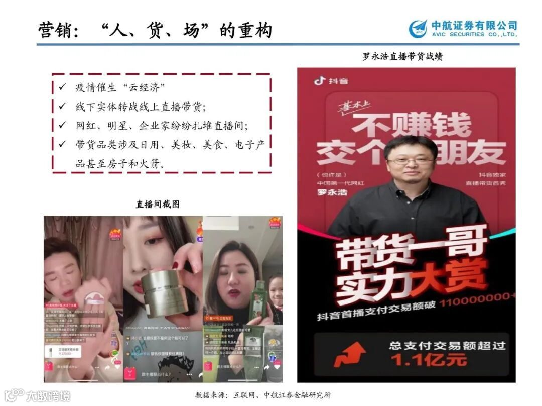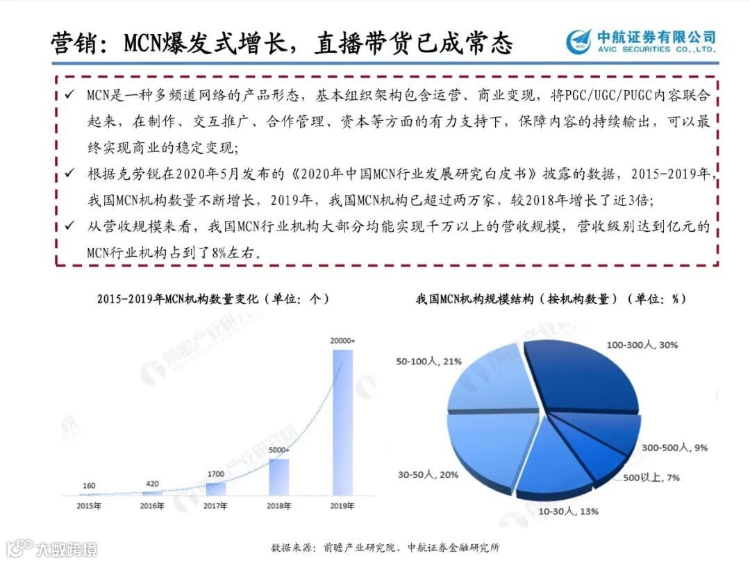 直播、短视频已经成为越来越多商家带货的途径,依托新型社交媒体的新零售增速明显,背后折射的是人、货、场之间关系的重塑,消费者圈层和路径发生了根本变化。影视公司也纷纷试水MCN领域,寻求新变现空间,华谊兄弟在2020年一季报中明确表示,公司已开始布局线上短视频及MCN业务,万达传媒在今年2月与愿景娱乐共同成立合资公司印特玛特;芒果超媒全资子公司芒果TV于去年启动了“大芒计划”,发力孵化并构建“芒果系”KOL和MCN矩阵。疫情后时代,传统商业模式被迫转型,流量的变现新思路正在不断拓展,建议关注社交电商和网红带货行业的投资机会,【元隆雅图】【中广天择】【壹网壹创】。