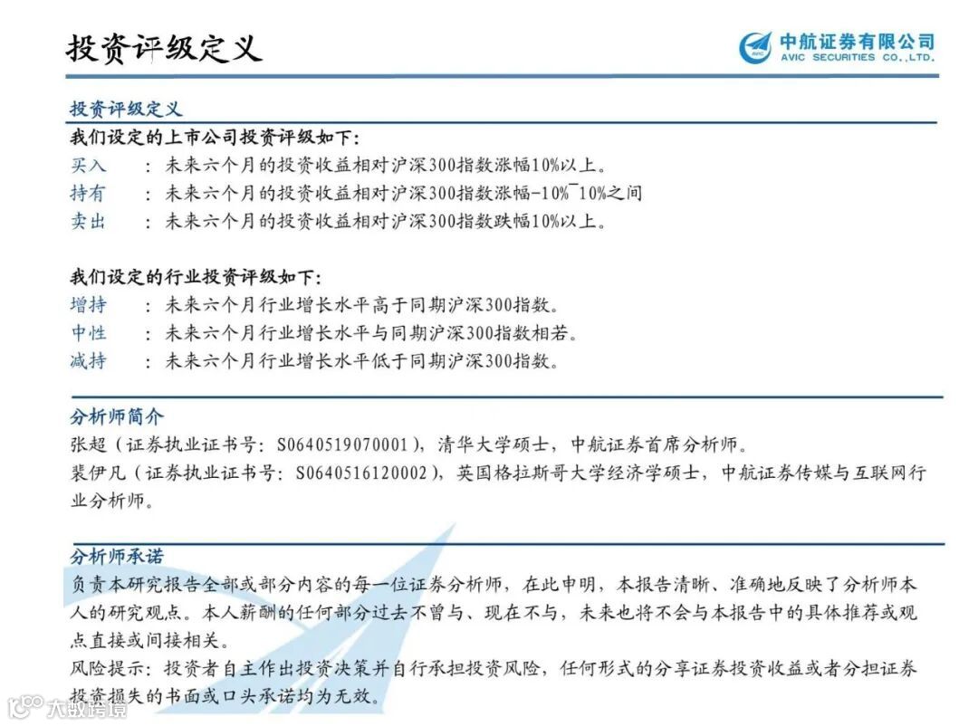 裴伊凡(证券执业证书号:S0640516120002),中航证券传媒与互联网行业分析师,英国格拉斯哥大学经济学硕士,曾供职于CCTV-2,聚焦影视、互联网、营销、游戏等大文娱领域。