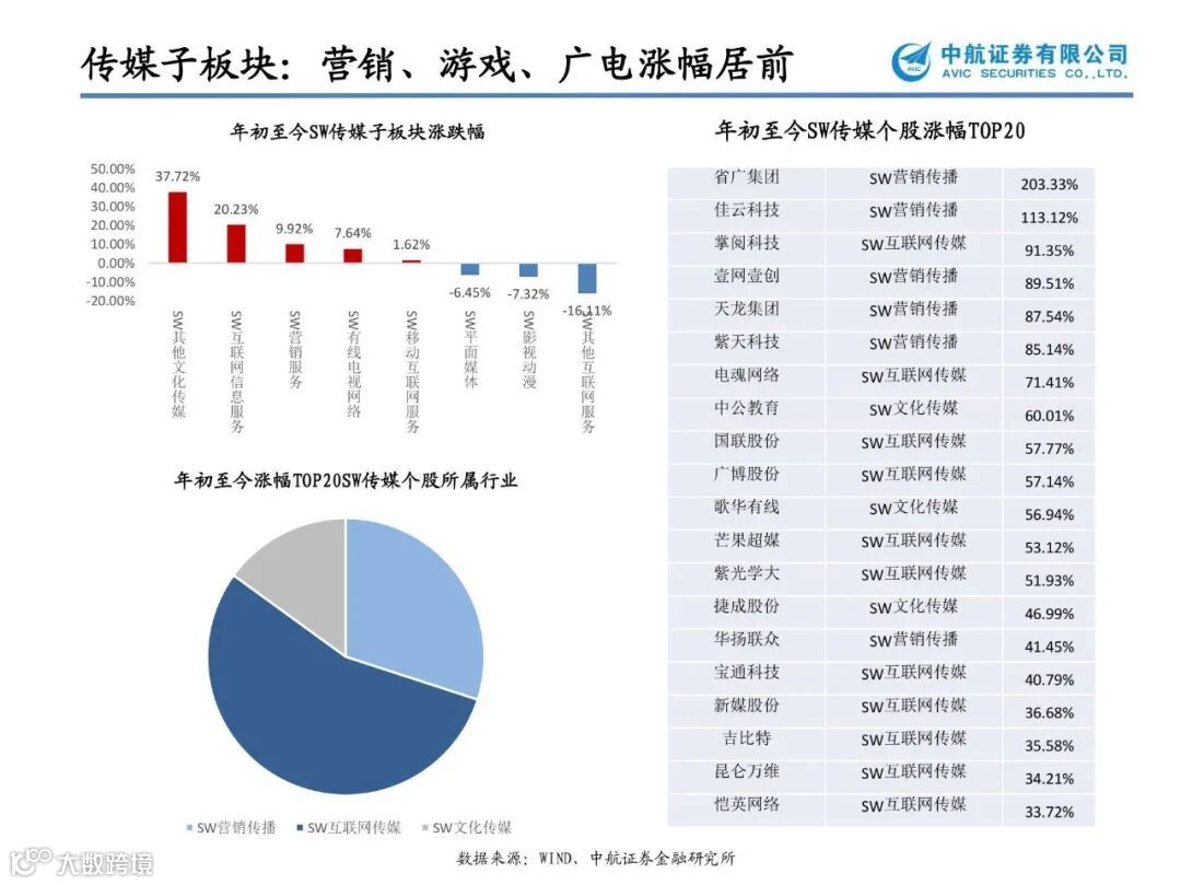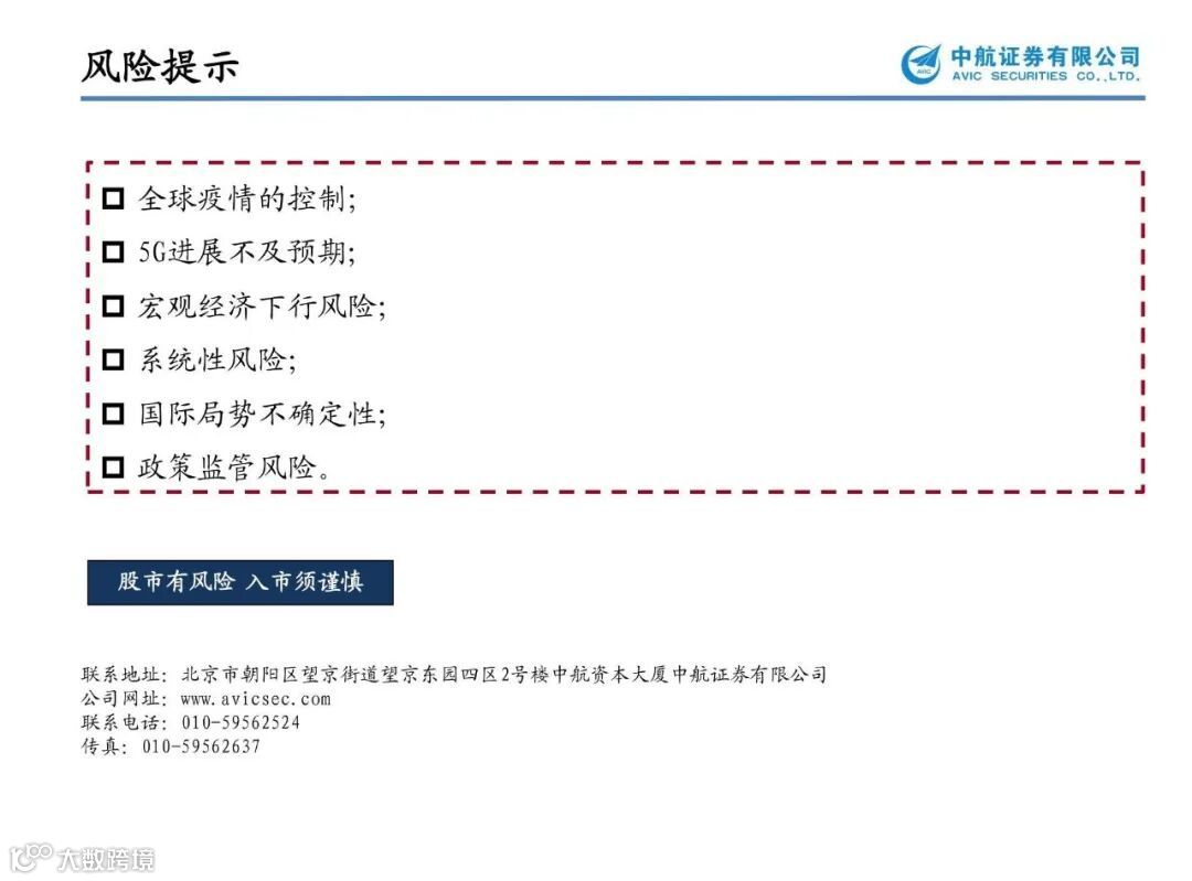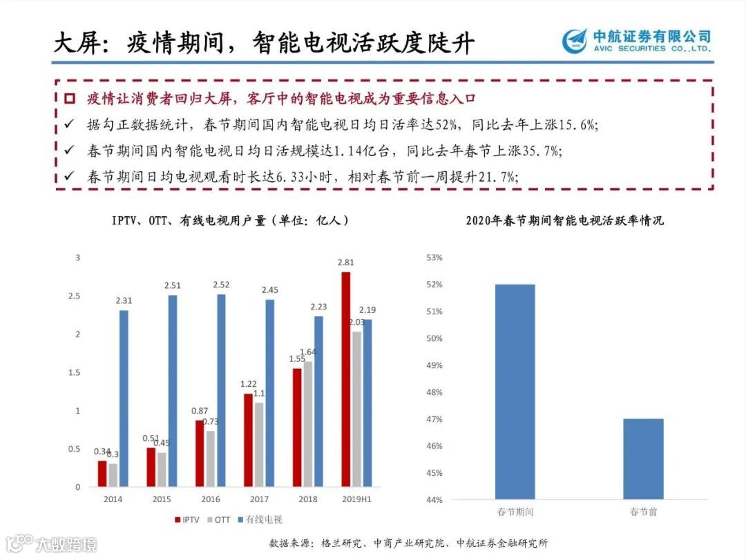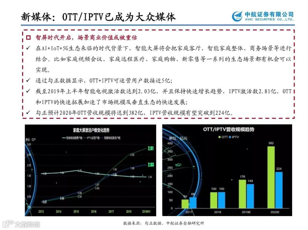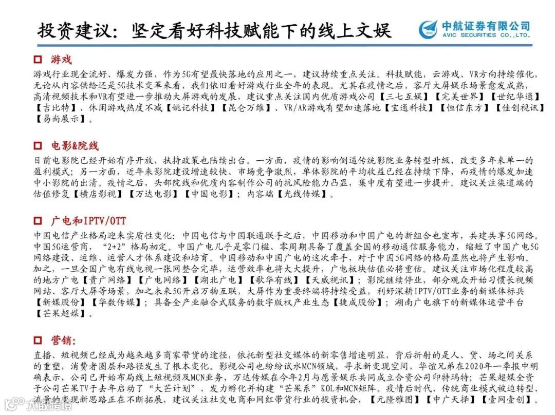 中国电信产业格局迎来实质性变化:中国电信与中国联通联手之后,中国移动和中国广电的新组合也宣布,共建共享5G网络。中国5G运营商,“2+2”格局初定。中国广电几乎是零门槛、零周期具备了覆盖全国的移动通信服务能力,缩短了中国广电5G网络建设、运维、运营人才体系建设和培育。中国移动和中国广电的这次牵手,对于中国5G网络的格局显然也将产生影响。加之,一旦全国广电有线电视一张网整合完毕,运营效率也将大大提升,广电板块估值必将重估。建议关注市场化程度较高的地方广电【贵广网络】【广电网络】【湖北广电】【歌华有线】【天威视讯】;影院继续停业,部分观众开始习惯长视频网站、客厅大屏等场景,加之未来5G开启万物互联,大屏作为重要终端将持续受益,利好深耕IPTV/OTT业务的新媒体标兵【新媒股份】【华数传媒】;具备全产业融合式服务的数字版权产业生态【捷成股份】;湖南广电旗下的新媒体运营平台【芒果超媒】。