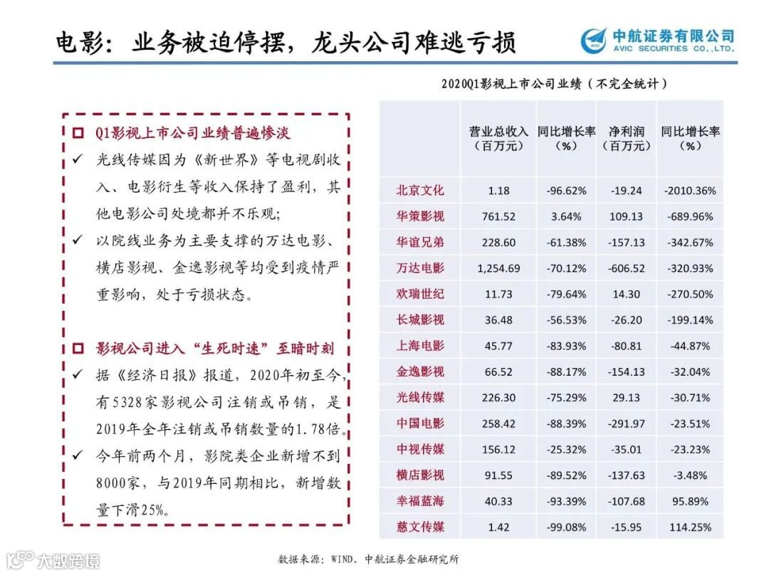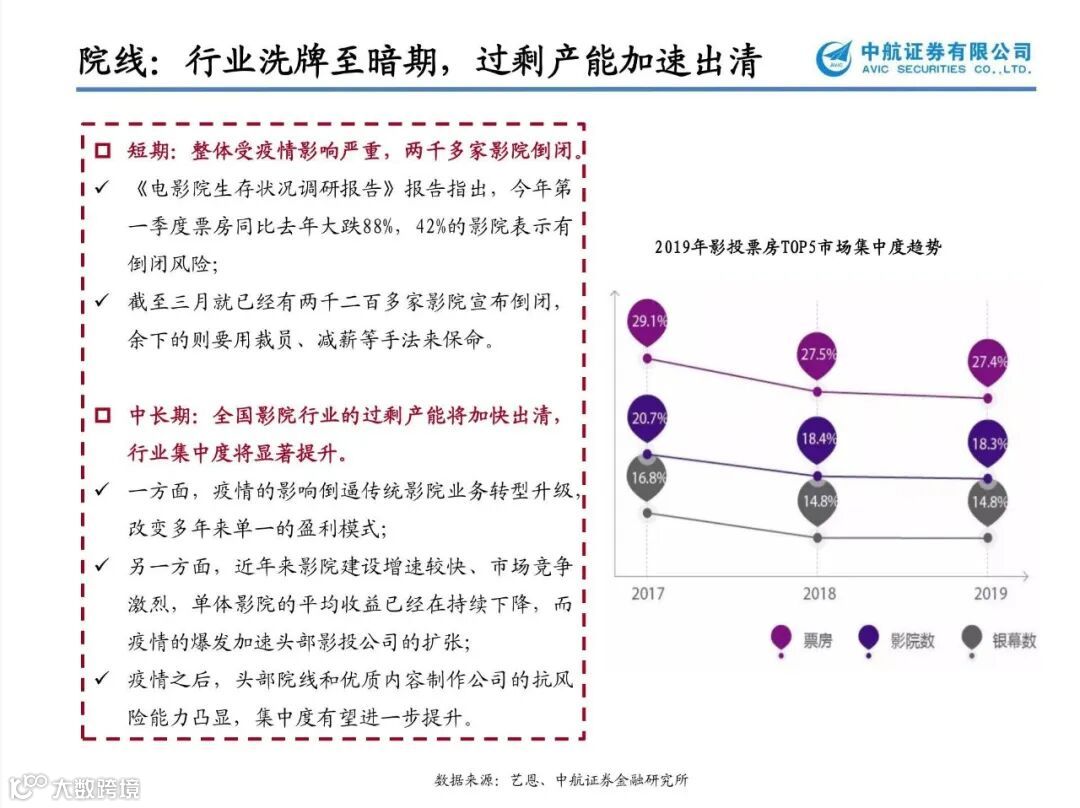 目前电影院已经开始有序开放,扶持政策也陆续出台。一方面,疫情的影响倒逼传统影院业务转型升级,改变多年来单一的盈利模式;另一方面,近年来影院建设增速较快、市场竞争激烈,单体影院的平均收益已经在持续下降,而疫情的爆发加速中小影院的出清。疫情之后,头部院线和优质内容制作公司的抗风险能力凸显,集中度有望进一步提升。建议关注渠道端的估值修复【横店影视】【万达电影】【中国电影】;内容端【光线传媒】。