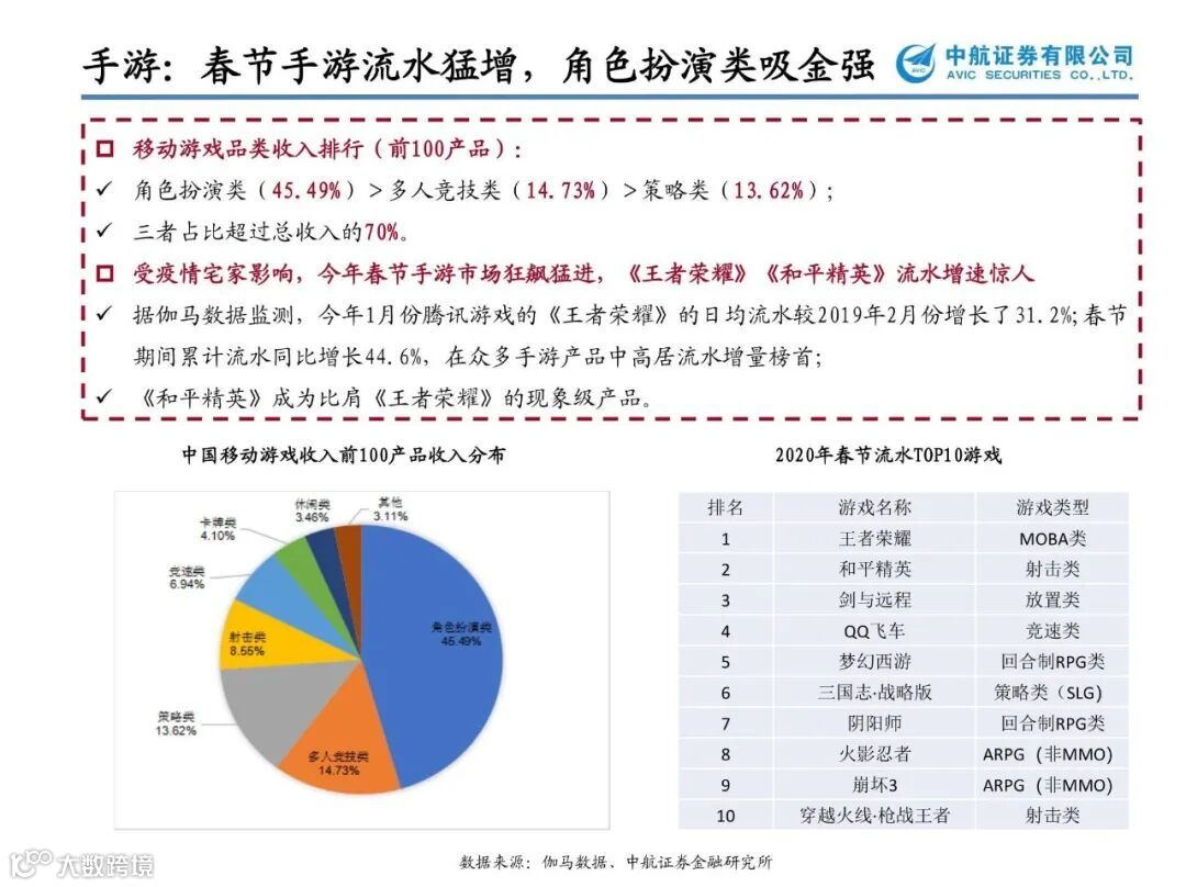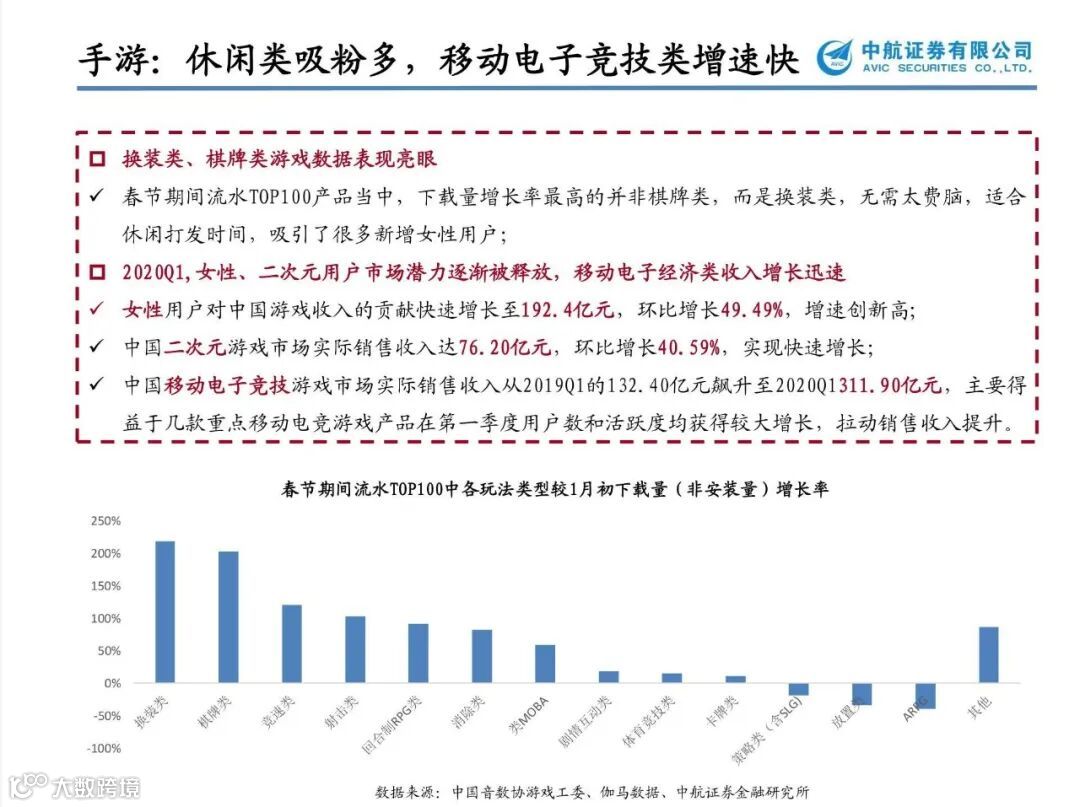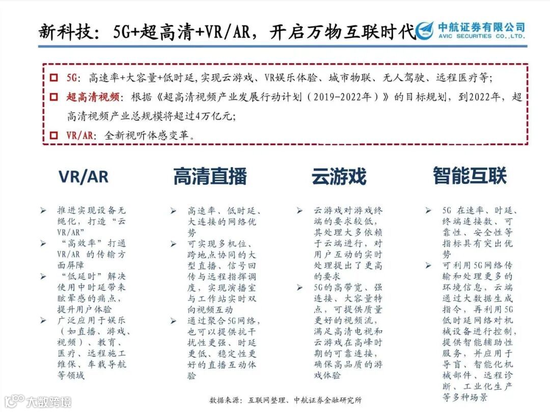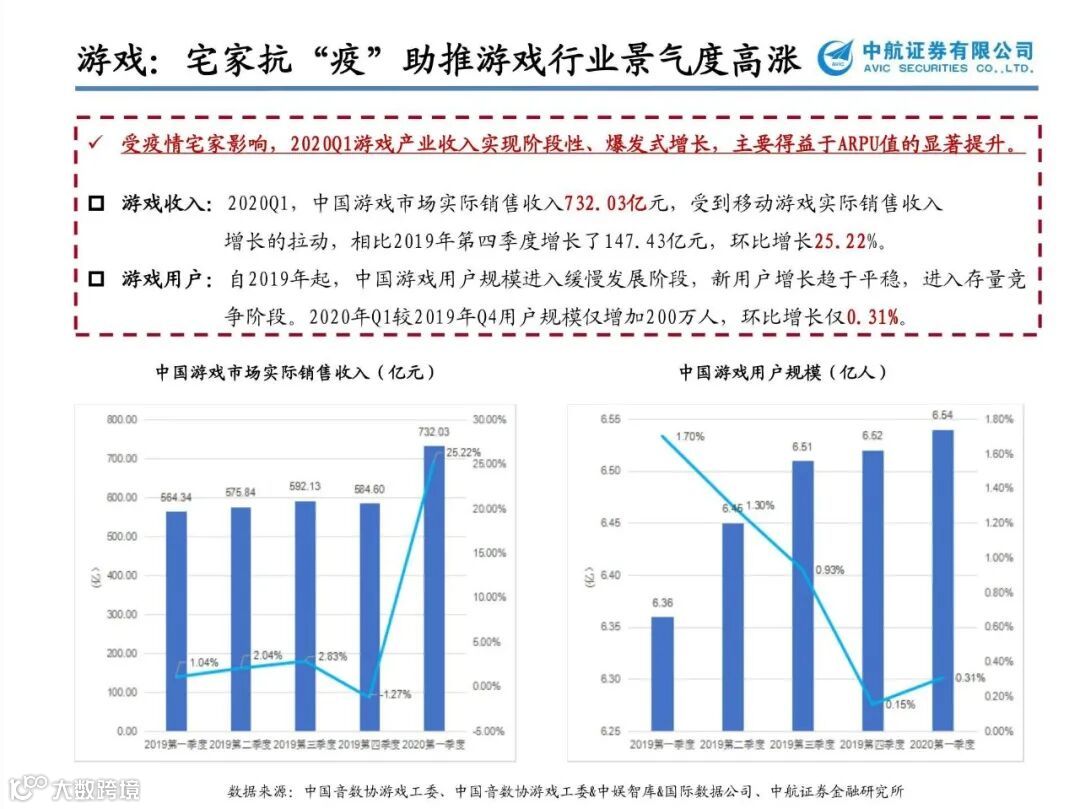 游戏行业现金流好、爆发力强,作为5G有望最快落地的应用之一,建议持续重点关注。科技赋能,云游戏、VR方向持续催化,无论从内容供给还是5G技术变革来看,我们依旧看好游戏行业全年的表现。尤其在疫情之后,客厅大屏娱乐场景愈发成熟,高清视频技术和VR有望进一步推动大屏游戏的发展,建议重点关注国内优质游戏公司【三七互娱】【完美世界】【世纪华通】【吉比特】,休闲游戏热度不减【姚记科技】【昆仑万维】、VR/AR游戏有望加速落地【宝通科技】【恒信东方】【佳创视讯】。