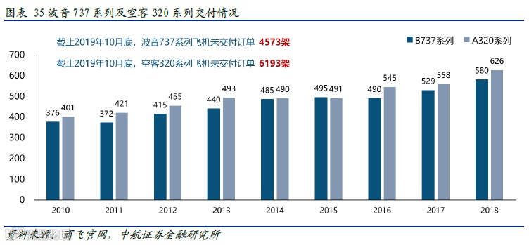 截止2019年10月底,空客320系列飞机未交付订单6193架;波音737系列飞机未交付订单4573架;两款机型的订单合计10766架,2018年合计交付1206架。按照此前的交付速度,以及波音737MAX停产,目前的订单需要消化十年以上。
