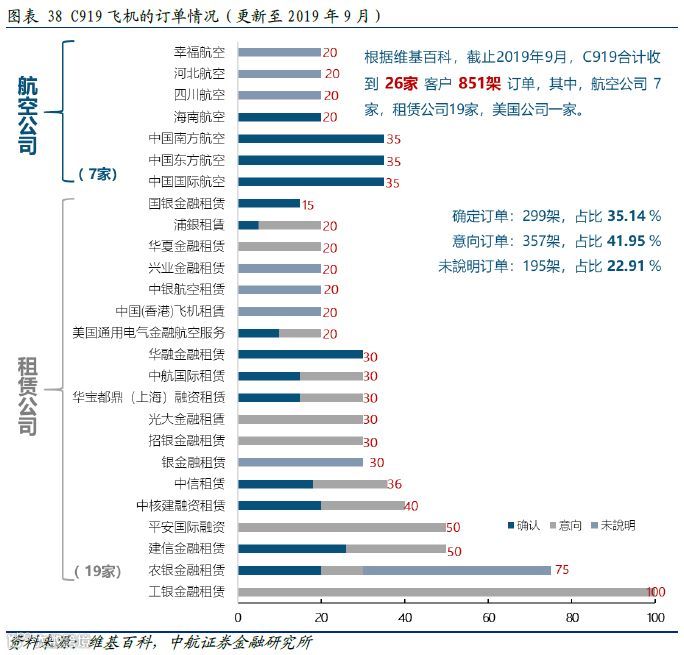 C919目前主要依靠政府的支持,已有订单集中在国内几大航空公司和国内银行租赁公司,不过,美国通用电气金融航空服务公司和泰国都市航空公司也分别订购20架和10架。根据维基百科,截止2019年9月,订单合计851架,其中,确定订单299架,意向订单357架,未说明订单195架。