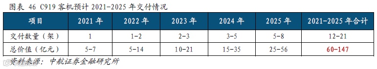 飞机制造过程非常复杂,交付速度受到全产业供应链的制约,同时也在持续的改进和调整。所以,C919客机的交付数量,我们认为可以参照ARJ21飞机的交付进度,预计为:2021年至2023年,每年交付1-3架;2024年至2025年,每年交付3-8架;2025年之后,C919飞机有望将进入快速交付阶段。