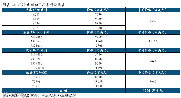 A320系列和B737系列价格如下表,均价为9701万美元。目前,C919的售价还没有公开报道,我们估计C919的单价在5-7亿元人民币左右。