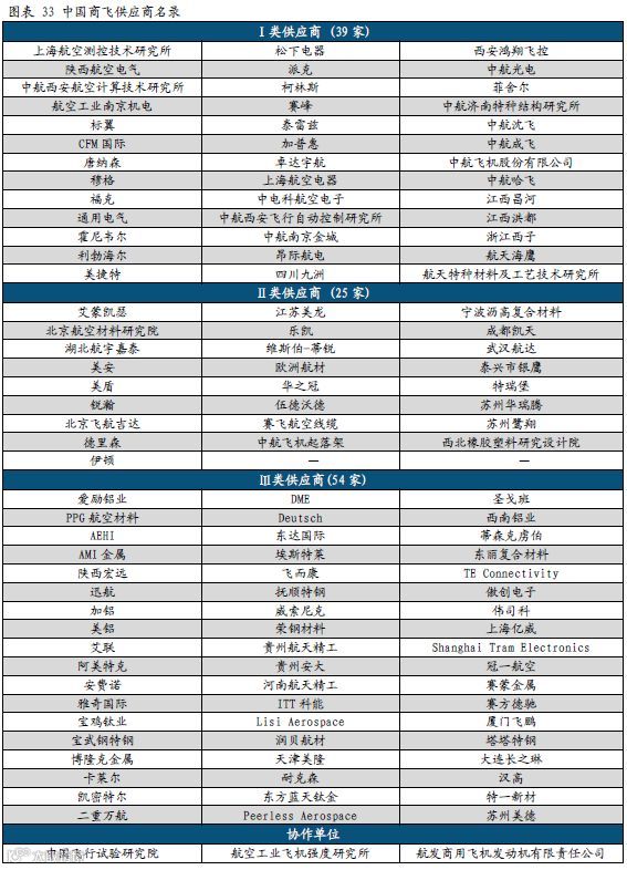 从中国商飞的最新数据来看,大飞机C919项目Ⅰ类供应商有39家,Ⅱ类供应商有25家,Ⅲ类供应商有57家以及3家协作单位,总计124家。其中,一类供应商中,合资企业2家,外资企业企业16家,中资企业21家。