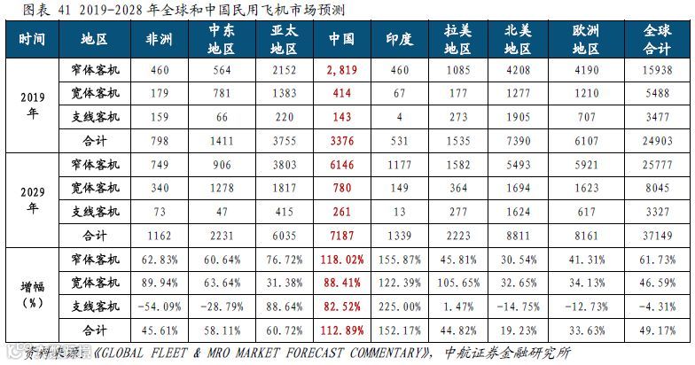 中国现在已经成为全球除美国以外的最大的民用飞机市场,根据《中国商飞公司市场预测年报(2019-2038)》,到2038年,预计将有45459架新机交付,全球客机机队规模将达到49558架,是现有机队的2.1倍。亚太地区(含中国)是增长最快的市场,其机队占全球的比例将从目前的31%增长到2038年的40%;其中,中国占全球客机机队比例将从现在的16%增长到21%。