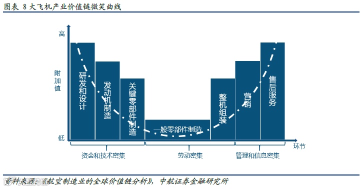 大飞机价值链条是由从研发设计到售后服务的一系列环节组成,价值分布呈“微笑曲线”状。位于前端的研发设计、发动机制造、关键零部件制造属于资金和技术密集型,具有较高的附加值;位于后端的营销、售后服务属于管理和信息密集型,附加值也较高;中间的一般零部件制造、整机组装环节属于劳动密集型,附加值相对较低。