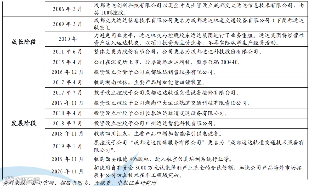 公司是国内轨交智能化领军企业,依托西南交通大学科研背景,前身为成都交大运达信息技术有限公司,由成都运达创新科技有限公司于2006年出资设立,2011年整体变更为股份有限公司,2015年4月23日上市。截至目前,公司报表涵盖轨道交通智慧培训系统、车载智能设备、机车车辆智能运维设备、智能牵引供电设备四大业务板块。具体产品方面,公司现阶段拥有模拟仿真和智慧轨交两大类主营产品,为轨道交通提供智慧培训解决方案、智能运维解决方案、智慧车辆段解决方案、智能牵引供电解决方案、智慧物流解决方案及维保服务。公司于2019年收购西安维德40%股权,2020年拟以自有资金3000万元认缴保利产业基金的合伙份额,进入航空仿真培训行业并涉足军工领域。
