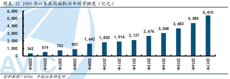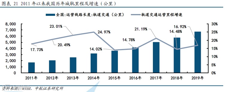 我国城市轨道交通投资额度连年走高。从投资额度上来看,进入“十三五”的四年来共完成轨道交通投资19992.7亿元,共新增新线长度3118.2公里,年均新增线路779.6公里。以2019年底建设规划线路计,假设我国未来每年新增城市轨道交通800公里,我国城市轨道交通未来8到10年内,年均仍具有至少5000亿元投资强度,对相关企业的业绩形成持续支撑。