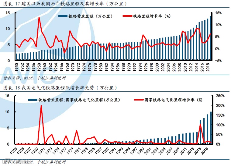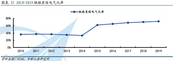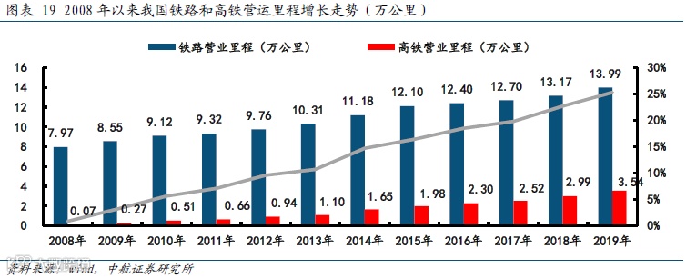 基于电气化改造和高铁全面覆盖需求,国铁建设保持高增长。从铁路总运营里程增长来看,我国铁路有两个建设高峰,建国后的“一五”、“二五”计划期间,以及2008年开始大力兴建高铁及对原有铁路进行电气化改造。到2019年底,我国铁路运营里程达到13.99万公里,其中电气化率达到71.77%;高铁从2008年的不到1千公里增长到3.54万公里,占我国铁路运营总里程的25.30%。2020年8月,国家铁路集团出台《新时代交通强国铁路先行规划纲要》,提出到2035年,要实现“现代化铁路网率先建成。铁路网内外互联互通、区际多路畅通、省会高效连通、地市快速通达、县域基本覆盖、枢纽衔接顺畅,网络设施智慧升级,有效供给能力充沛。全国铁路网20万公里左右,其中高铁7万公里左右。20万人口以上城市实现铁路覆盖,其中50万人口以上城市高铁通达。