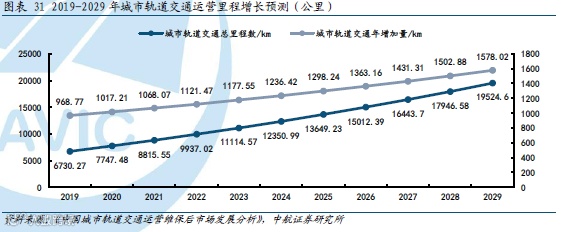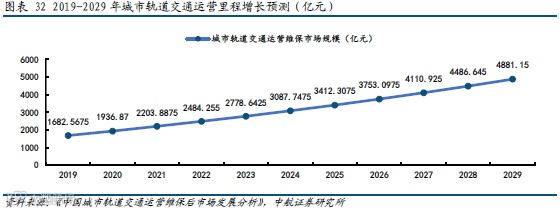 轨道交通运营维保后市场空间与运营里程和车辆保有量正相关,与轨道交通重置成本保持一定的比例关系。以城市轨道交通为例,由于我国铁路服务由中国铁路总公司负责提供,通过城轨投资总额来计算运维服务市场大小。截至2019年底,我国城市轨道交通运营里程为6730.27km。根据行业经验,城市轨道交通运营维保支出一般占总投资的2%~3%。考虑重置成本为每公里平均造价10亿元,按照中位数2.5% 测算,2019年我国城市轨道交通运营维保后市场规模约为1682亿元。根据中国城市轨道交通协会的预测,未来10年全国城市轨道交通总运营里程将持续增加,新开通线路里程也呈逐年增加趋势。假设年增长率为5%,预测 2029年将新开通1578.02km,总运营里程将达到约1.95万km,为2019年运营里程的2.9倍。至2029年,城市轨道交通总建设投资将达到19.5万亿,年运营维保市场规模将达到4875亿元。