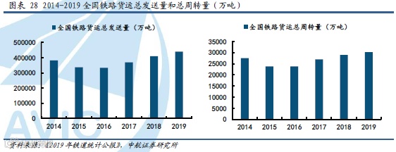 铁路货运需求不断提升,运力释放打开未来市场空间。铁路货运方面,在经历了2014-2016年的下降后,货运量在2017-2019年连续上扬。2019年全国铁路货运总发送量完成43.89亿吨,比上年增加2.96亿吨,增长7.2%。全国铁路货运总周转量完成30181.95亿吨公里,比上年增长4.3%。根据《铁路“十三五”发展规划》,到2020年,全国铁路货运量将达到37亿吨,货运周转量达到25780亿吨公里。在“公转铁”、“多式联运”等政策的引导下,未来随着铁路货运需求的不断提升,在配套编组站建设完备及货运线路将运力释放后,预计铁路货运有望迎来繁荣发展期。