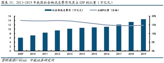 我国社会物流总费用不断上升,降本增效初显成效。社会物流总费用指报告期内国民经济各方面用于社会物流活动的各项费用支出的总和,包括运输费用、保管费用、管理费用。从2009-2019年我国社会物流总费用可以看出,社会物流总费用逐年增长,社会物流总需求不断上升。同时从2013年开始,社会物流总费用占GDP比重基本处于逐年下降趋势,表明我国社会物流效率近年来在逐步提高。可以看出,我国物流业近些年一直处于持续景气、向上发展的态势,且已经从高速增长阶段转为较慢增长的高质量发展阶段。