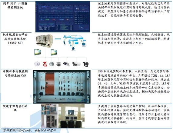公司车载智能设备以CMD车载系统为载体,数据采集平台(LDP)为核心,实施监控并搜集列车安全信息和状态信息。公司机车车辆智能运维设备包含智慧车辆段产品和智能运维解决方案两部分内容。其中,公司智慧车辆段产品以智能化和自动化设备取代传统的依靠人工的轨道交通维修厂流程,对传统轨交车辆维保方案进行智能化改造;智能运维解决方案提供列车状态感知与跟踪、故障诊断预警、剩余寿命预测、运维智能决策、作业自动化等能力。同时,公司智慧车辆段解决方案和公司智能运维解决方案也可组成一个完整的交互系统,两大系统产生的数据可以互相交互耦合,形成一个包含轨交运营和维修的综合系统。