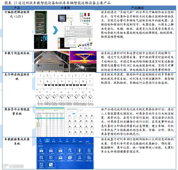 车载智能设备主要是机车车辆车载监测与控制设备,机车车辆智能运维设备主要是机车车辆整备与检修作业控制系统,二者均为公司上市时主要产品。公司在轨道交通机务段、车辆段工艺设备领域积累了丰富的项目经验,通过参与大量前期段、场工艺布局设计,各专业接口协调、联调、联试等各个过程,熟悉车辆临修、计划修、大架修工艺,可为客户提供专业化、智能化的系统整体解决方案。相关产品核心在于海量数据搜集和公司开发的分析决策系统。公司的智能解决方案具有精准性高、长期综合成本低等优势。随着公司产品不断进入市场,更多数据补充到云端,公司的智能决策系统将不断升级。