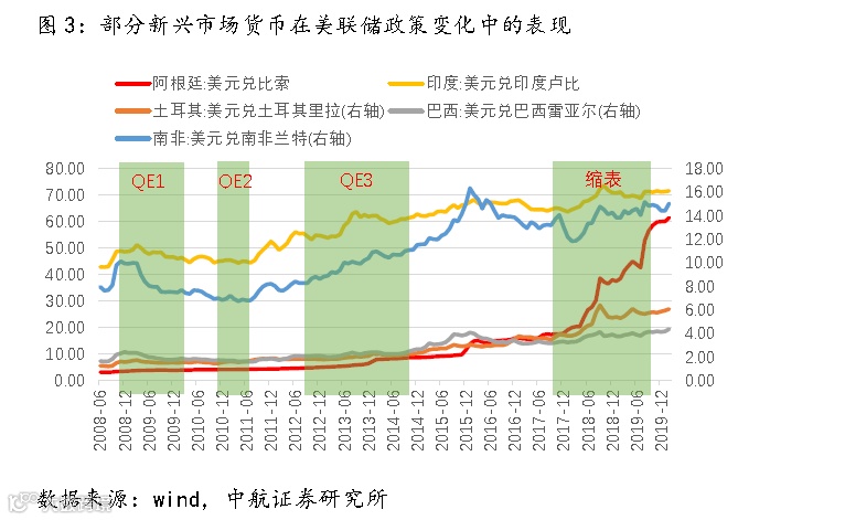 从历史数据来看,每次QE的推出都造成了美元阶段性走弱,而各轮QE的结束以及2017年开始的缩表都推动了美元快速走强。美元变化的另一面是非美货币的大幅波动。由于印度、土耳其、阿根廷等新兴经济体的经济增速普遍在2009和2010年实现快速反弹后,出现逐步走弱的趋势,因此在QE1和QE2期间,多数新兴经济体货币表现较强,实现不同程度的升值。但在QE3阶段,虽然美元总体表现平稳,但新兴市场货币对美元普遍出现较明显的贬值,其中除了美联储缩减购债规模和美元阶段性走强的影响外,各国国内经济状况较差、高通胀(如阿根廷)、政局不稳(如土耳其)等也是导致货币走弱的重要因素。在美联储缩表阶段,新兴市场货币继续走弱,土耳其、阿根廷甚至爆发了货币危机,虽然危机的出现存在各国国内债台高筑、国内货币超发导致通胀失控等内因的影响,但不可否认的是,美联储不断收紧流动性是诱发部分新兴市场货币危机的主要外因。