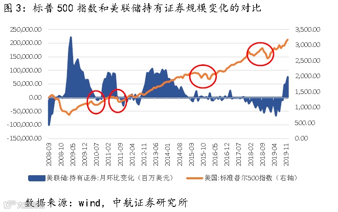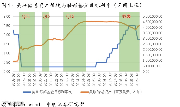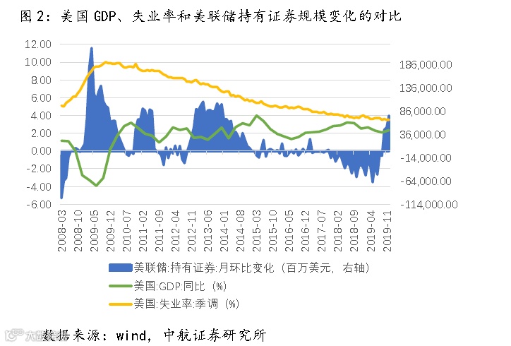 在QE3结束之后的几年里,美联储资产负债表规模基本稳定在4.5万亿左右的水平,但美联储在2015年底就启动了加息进程,宣告货币政策开始回归正常化。此后GDP增速逐步回升,失业率持续下滑,经济呈现向好趋势,因此在2017年10月美联储开始启动缩表。缩表进程一直持续到2019年,由于资本市场波动和经济增速放缓等因素的影响,美联储在2019年提前结束了缩表,并从9月再次开始了扩表。