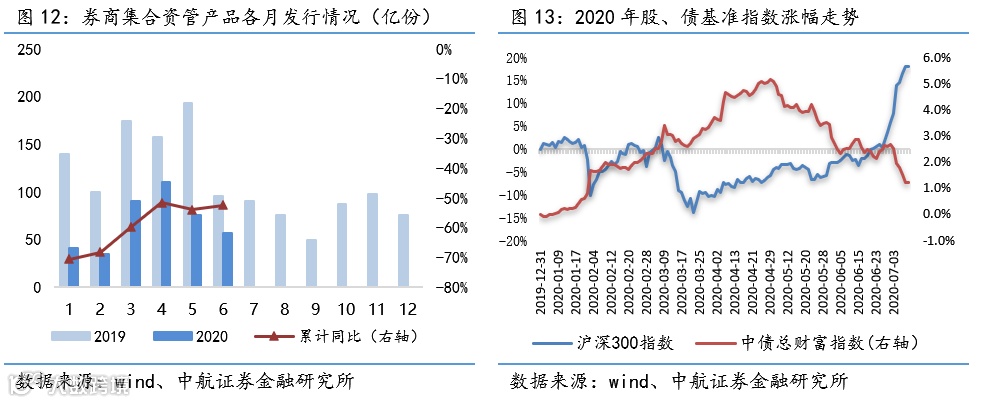 资管:截至2020Q1,券商资管规模合计9.97万亿元,同比-24.91%。截至6月年内券商集合资管产品新发行份额累计同比-52.58%。