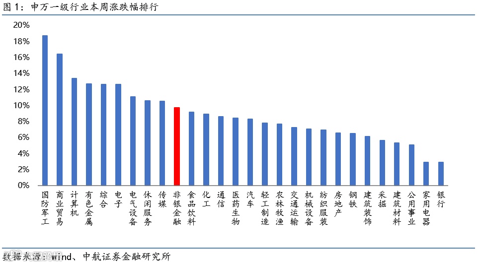 非银板块本周上涨9.73%,涨跌幅在28个申万一级行业中排第10。子板块方面,券商上涨12.44%,保险上涨6.52%,多元金融上涨7.40%。