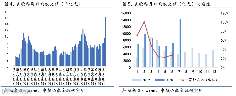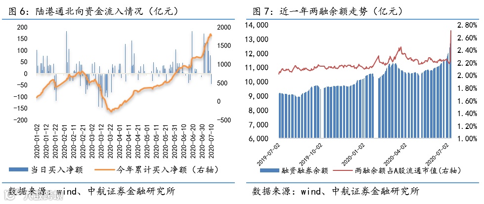 经纪:A股本周日均成交额16369亿元,较上周+77.12%,7月日均成交额环比+96.15%,同比+257.42%,截至6月年内累计成交额同比+27.95%;本周陆港通北向资金净流入282亿元,较上周-7亿元。