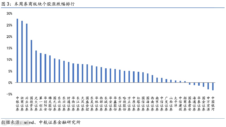 涨跌幅前三:中银证券(+27.76%)、浙商证券(+26.75%)和兴业证券(+25.54%);