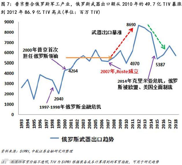 三、外贸出口为俄军工国内军民融合、产业重组发展资金来源;军机出口份额从未低于40%