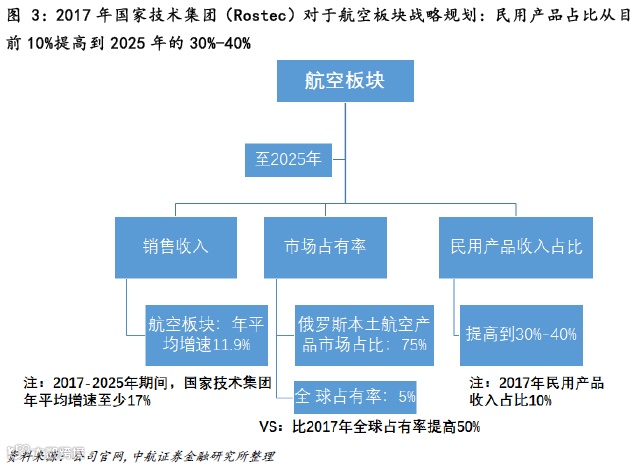 2017年2月7日,俄罗斯国家技术集团公布了集团旗下航空板块(Aviation Cluster)发展战略。该战略规划至2025年,预期航空板块年销售收入年均增长11.9%,2025年力争超过1.5万亿卢布;全集团年销售收入增速至少达到17%;通过建立生产设备交易所提高营业效率,将集团生产载荷从55%提高到80%。