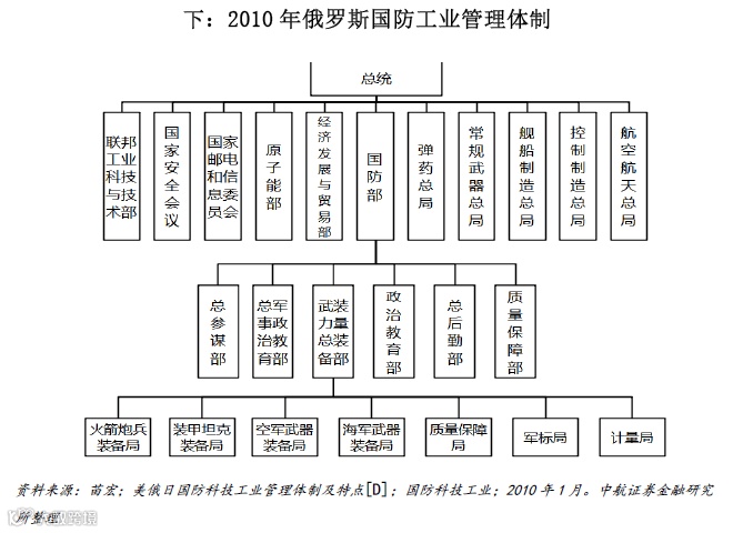 1991年苏联解体后,俄罗斯对其所继承的原苏联国防工业管理体制进行改组,以改变原来高度计划性质的武器装备生产体制。随着国际油价上涨,俄罗斯国家财政逐渐好转,2004年3月,二次当选总统的普京再次改组国防工业管理体系。国防工业企业的直接管理权集中在新成立的工业与能源部,又下设工业署,专门管理国防工业的订货需求;航天和航空两部分分开,分别成立联邦航天局和联邦工业局。此后俄罗斯对其国防工业体系不断进行调整,以适应自身国情和外部挑战的变化。