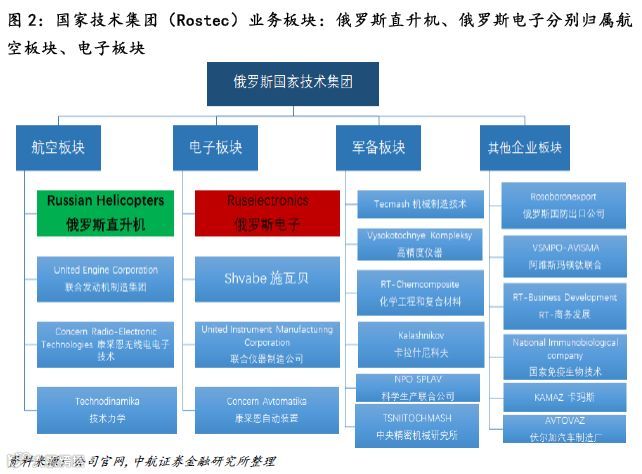 2007年俄罗斯注资成立国家技术集团(Rostec),被市场普遍认为是俄罗斯现代军民融合的序幕。目前Rostec旗下囊括700多家企业,控股15家公司,直接管理70家机构,主要分为三个板块:航空板块、电子板块和武器装备板块,工厂分布俄罗斯60个州,产品出口近70多个国家。经过十几年发展,Rostec已经发展成世界上最大的军民融合集团。