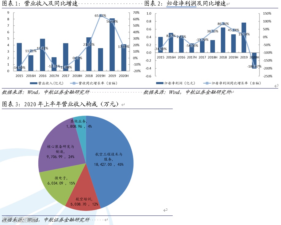 公司已形成核心装备研发与保障、航空工程技术与服务、集成电路研发与制造的三位一体产业布局,今年上半年民航业受疫情影响较大,航空培训业务营收规模降幅显著,但高端装备研发与保障、集成电路设计与制造同比出现较大增长,公司整体营收仍增长17.69%,毛利率39.82%。分业务板块来看,核心装备研发制造与保障、航空工程技术与服务、航空培训、微电子分别实现营收0.97亿元、1.84亿元、0.5亿元、0.6亿元。
