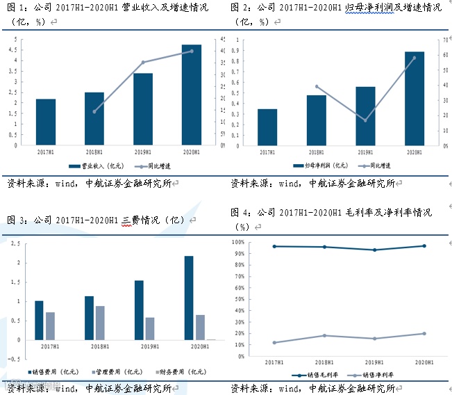 公司在保持营收及盈利快速增长的同时,各项财务指标表现突出。其中,销售毛利率达到96.91%(+3.93pcts),创近4年同期新高;实现经营性现金流量净额(0.88亿元,+99.52%);有息负债继续为0;期末存货占营收的比例仅为1.78%,销售获现比率高达98.13%,经营质量极高。归母净利润增速高于营收增速18.35pcts,源于其经营总成本增速低于营收增速14.29个pct,成本控制能力优异。公司上半年发生财务费用(85.20万元,+303.23%),主要系汇兑损益变动所致。