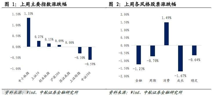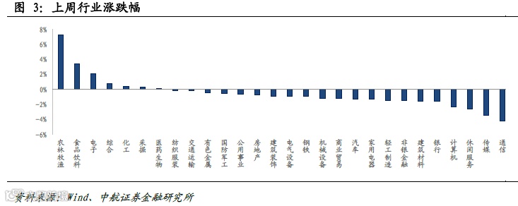 本周A股继续震荡,上证指数周跌0.3%,沪深300指数周涨0.09%,创业板指周涨0.15%。全周北向资金净流入81.48亿,较上周有明显增长,但日均成交额和换手率均较上周有所下降。风格上,本周金融股跌1.23%,周期股跌0.70%,消费股涨1.49%,成长股跌1.67%,稳定股跌0.64%。行业表现方面,本周表现排名前三位的是农林牧渔(7.30%)、食品饮料(3.43%)、电子(2.11%),排名后三位的是通信(-4.16%)、传媒(-3.45%)、休闲服务(-2.63%)。估值方面,本周全部A股市盈率为16.03倍,较上周下跌1.11%,剔除金融、石油石化股后市盈率为26.27倍。