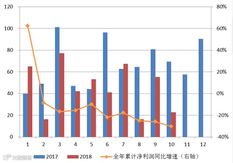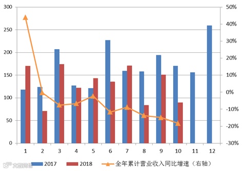 10月,A股上市券商实现营业收入合计101.19亿元,净利润合计24.79亿元,环比分别下降39.10%和下降58.04%,同比(可比口径)分别下降47.26%和下降67.00%。1-10月,累计实现营业收入合计1374.16亿元,净利润合计47.65亿元,累计同比(可比口径)分别下降18.35%和下降30.27%。累计净利润同比降幅继续扩大。