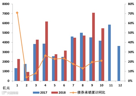 投行业务:10月投行股权类项目融资规模267亿元,环比-45.38%,同比-85.27%,其中IPO募集资金99亿元,环比-24.57%,增发募集资金134亿元,环比-57.47%。1-10月累计股权融资规模10688亿元,累计同比-20.93%,累计降幅较9月份扩大。其中IPO累计募集资金1253亿元,同比-34.58%,增发募集资金6663亿元,同比-35.47%。预计11、12月IPO发行方面难有显著改观,11月初再融资新政有望带动增发逐步回升。10月债券类项目承销规模5480亿元,环比-22.80%,同比+31.16%。1-10月累计债券类融资规模41377亿元,累计同比+20.95%。债券类项目继续保持较好增长势头。