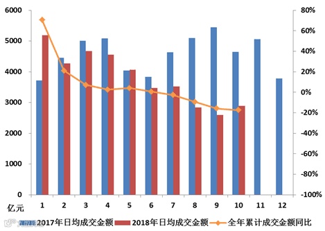 经纪业务:10月份A股日均成交金额2896亿元,同比-37.71%,环比+11.37%。1-10月累计成交金额较去年同期-17.34%,降幅较9月继续扩大。受益于宏观稳预期措施,股票二级市场走势企稳,交易量回升。但去年同期基数相对较高,预计全年累计交易量大概率较去年下滑。