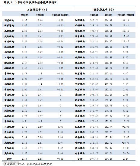 资产质量方面,2018年三季度我国GDP同比增速下降至6.5%,投资、消费依然较为疲弱,中美贸易摩擦持续升温,外需面临的不确定性较大,但上市银行资产质量仍较二季度末小幅改善,环比下降0.01个百分点至1.54%。其中,14家上市银不良率环比下降,6家持平,6家出现了反弹。国有行、股份行、城商行、农商行中资产质量环比改善幅度最大的分别为农业银行(-2bps)、浦发银行(-9bps)、成都银行(-5bps)和张家港行(-5bps)。拨备覆盖率方面,三季度末较上半年末提升2.84个百分点至197.64%,18家银行环比提升,8家银行环比下降,江阴银行环比提升幅度最大,拨备覆盖率较上半年末提高了34.24个百分点。