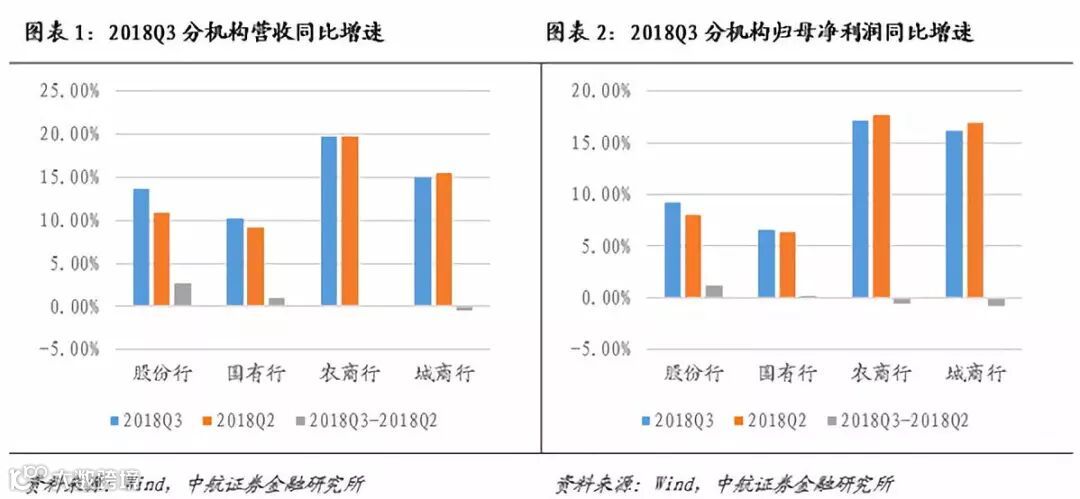 分机构来看,国有行/股份行/城商行/农商行2018Q3单季度营收同比增速依次递增,分别为10.19%/13.62%/15.01%/19.80%,环比二季度分别提升0.97/2.71/-0.51/0.01个百分点,股份行升幅最为明显。从三季度归母净利润同比增速来看,农商行依然表现最优,同比增长17.13%,环比来看,股份行改善最为明显,较2018Q2提升1.21个百分点。