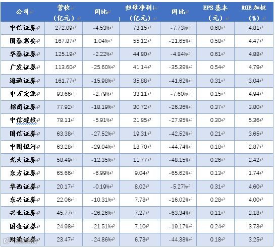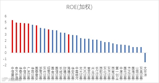 注:ROE(加权)根据三季报数据做年化处理;红色标记为营收和利润排名前八券商