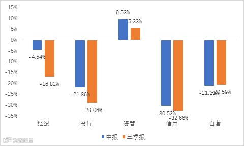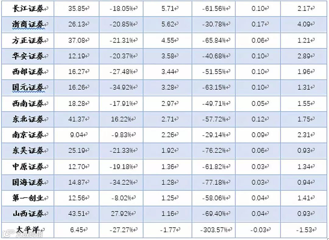 34家券商业绩集体下滑。从个股看,半年报中尚有包括行业龙头中信证券在内的五家券商业绩维持正增长,而三季报34家上市券商归母净利无一幸免全部下滑,其中太平洋证券是唯一一家亏损的上市券商。如表1所示,业绩下滑幅度超过50%、25%、10%的上市券商分别有13家、26家和29家,仅5家券商业绩下滑幅度低于10%,分别是华泰证券、华西证券、天风证券、申万宏源和中信证券。