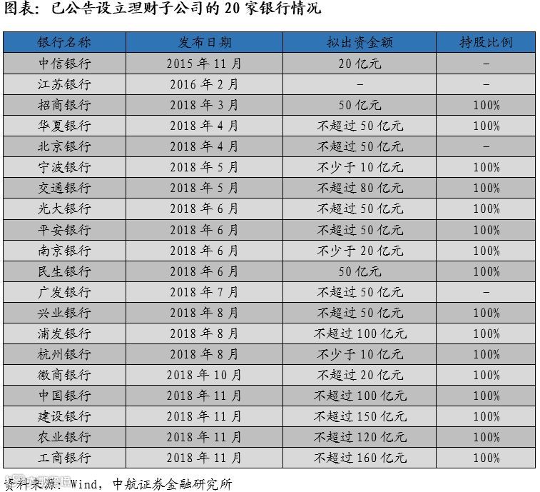 总体来看,正式稿较征求意见稿没有发生太大变化。目前,已有20家商业银行公告成立理财子公司,包括5家国有银行、9家股份制银行、6家城商行,拟出资金额中最高的是工商银行,不超过160亿元,最低是宁波银行和杭州银行,均为不少于10亿元,除广发银行、北京银行等个别银行未披露持股比例外,其余理财子公司均为母行100%控股。