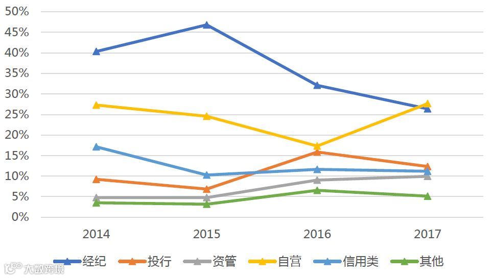 图 1:证券业各项业务占总收入比重变化(单位:亿元)