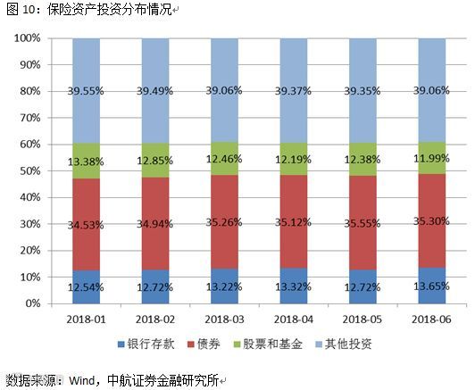 6月末,保险公司资金运用余额156874亿元,较年初增长5.14%。其中银行存款21420亿元,占比13.65%,较5月份上升0.93个百分点;债券55369亿元,占比35.30%,较5月份下降0.25个百分点;股票和证券投资基金18812亿元,占比11.99%,较5月份下降0.39个百分点;其他投资61273亿元,占比39.06%,较5月份下降0.29个百分点。今年以来保险投资活动存在一定压力,股市下行叠加国债收益率走低,投资活动存在较多不利因素,预计投资收益率将有所下降。随着中央稳金融政策的推出,预计金融市场投融资活跃度将有所回升,利好保险投资活动。