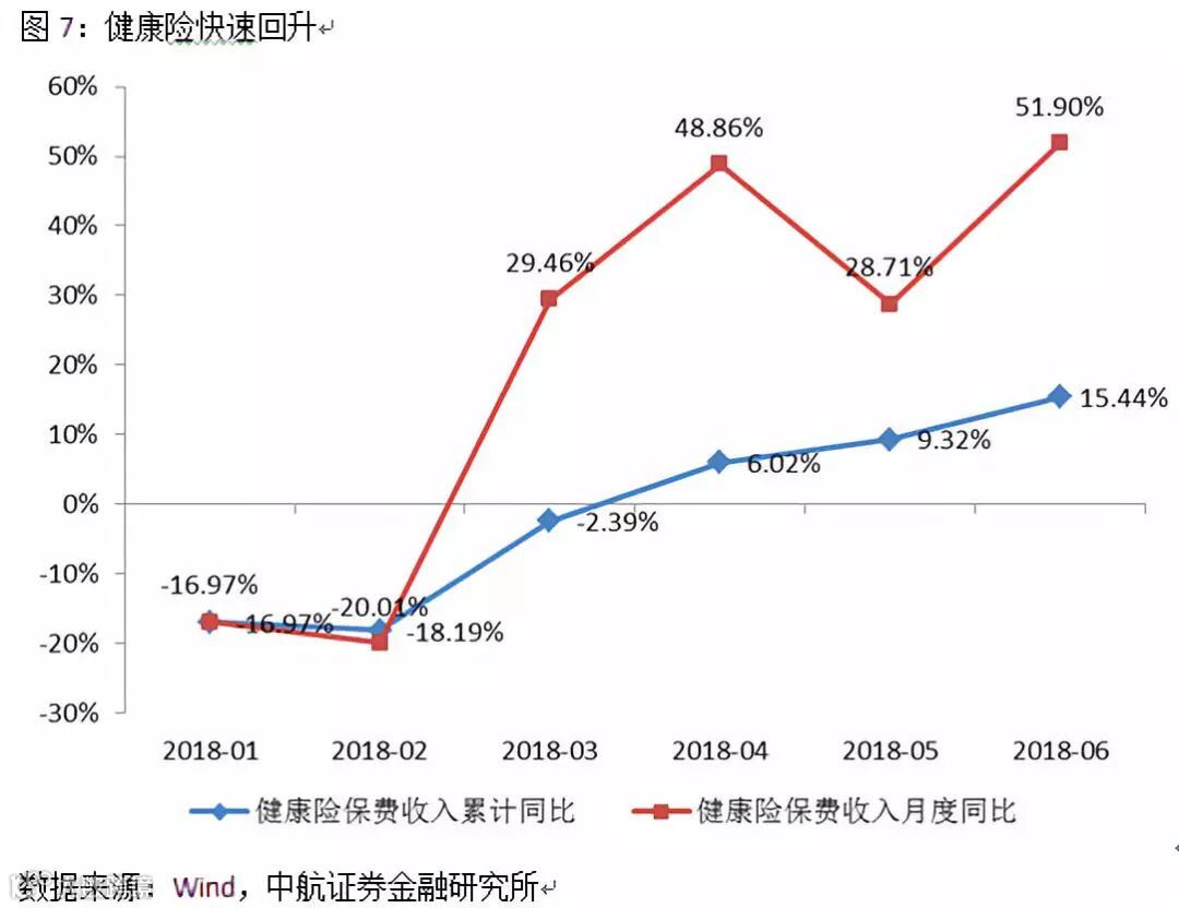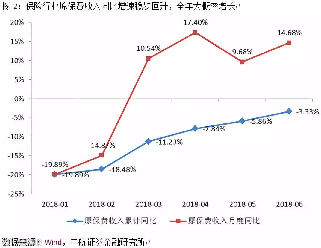 今年上半年以来保险行业原保费收入情况逐月走好,在年初同比下降19.89%的情况下,至6月末同比降幅已收窄至下降3.33%,并且3月份以来月度连续保持较高同比增速。自2017年保监会严管短期逐利产品、推动保险回归长期保障本源以来,在市场强劲保险需求支撑下,保险行业发展重新回到正确轨道,以人身意外伤害险、健康险为代表的保障性业务高速增长,正是这一积极变化的鲜明标志。保险行业转型发展、回归本源过程得到市场需求的可靠支撑,预计今年全年保费收入最终将实现同比增长。对比中美两国保险密度情况,我国保险密度相比美国仍然有较大差距,在我国经济持续增长的情况下,保险行业长期发展的空间十分广阔。